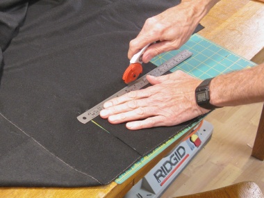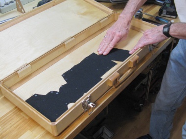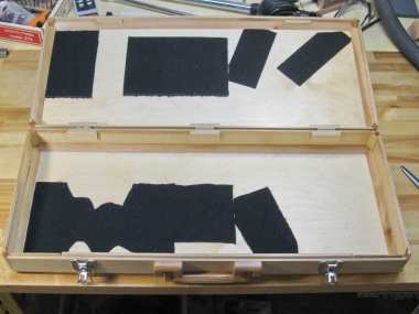 The inside of the case had been made almost exactly the height needed to clear the largest items so the case walls were exposed in a number of spots. Rather than leave that as bare wood, I decided to add some thickish black cloth to provide some anti-rattle capability. I marked the exposed areas and then glued down appropriately-shaped patches.