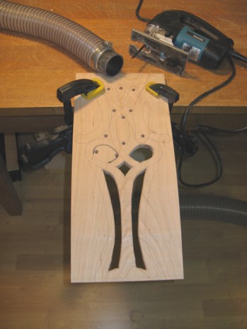 As the picture below shows, I drilled starter holes and then used a hand-held jig saw to cut out the unwanted sections of the blank, which would later be smoothed by hand.