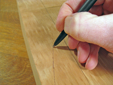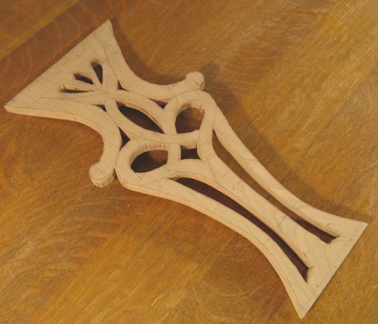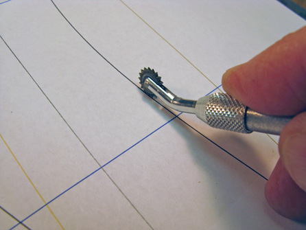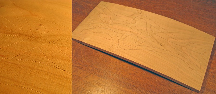 The pattern was then transferred to the blank using a pounce wheel (there is a picture of the wheel down further). The wheel produces indents in the wood along the outline, which I then use as a guide to ink in the pattern.