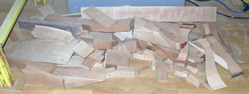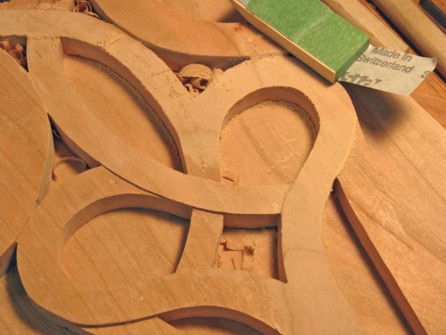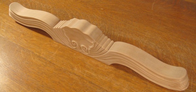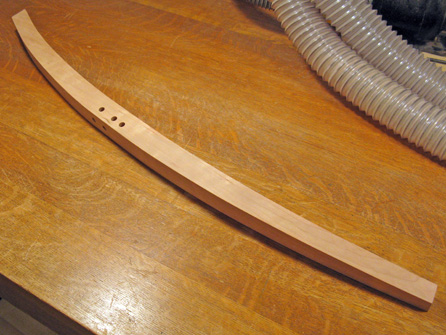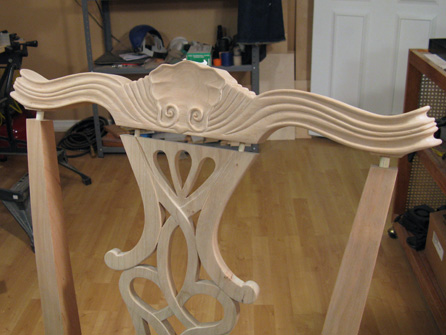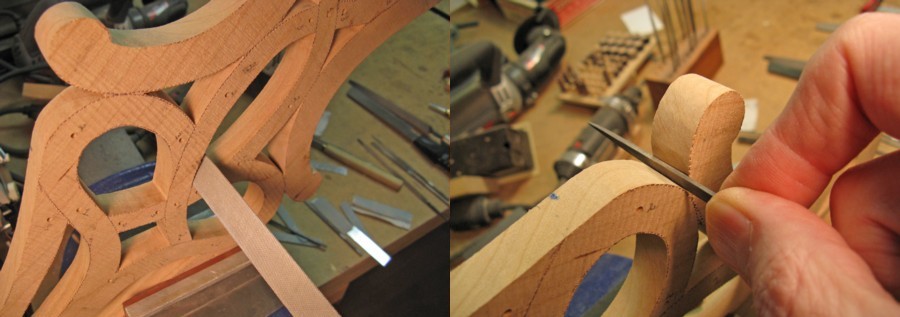 The top rail took just under 40 hours to complete, including the sanding (every hour of which feels like two). As usual with oddly shaped pieces, a number of custom sanding aids were required, from "standard" sanding forms of various curvatures to little sticks with custom-shaped ends to position small strips of sandpaper to ensure ridges were sanded with the grain.