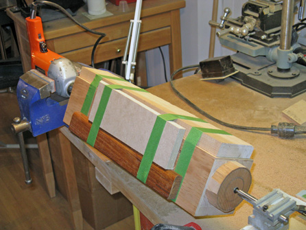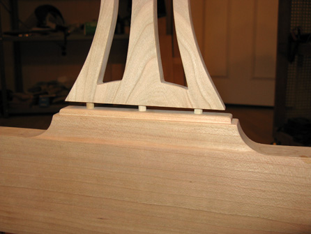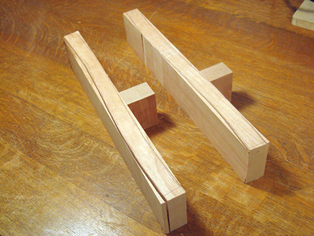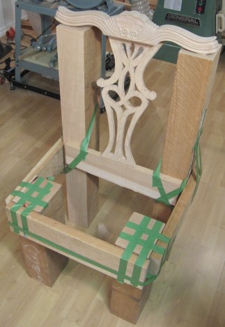 The above photo shows the side and rear rails with pins fitting into the rear leg. To the right is a shot of how the pieces were clamped together for gluing. When they were actually glued, the top rail was put in place and a spacer was used between the rear legs at the bottom make sure that everything was at the right angle.