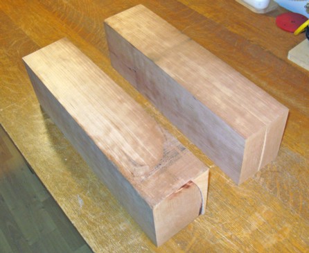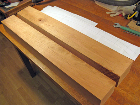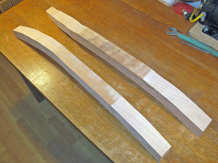 The rear legs were cut out of pretty large stock, but the finished size was no more than 1.5" square. I was concerned about warpage, since the stresses on the wood of the leg could change substantially when the waste was cut away. So instead of cutting the legs close to the finished size, I instead cut them about 0.5" large all around to get rid of most of the excess wood. And then I just let them sit for 2 or 3 months while I worked on other parts (which I guess is an advantage of a long project). That way, if they wanted to warp, there would likely still be enough wood to get to the finished shape that I wanted. The photo on the left below is the two leg blanks, and on the right are the two legs cut out oversized.