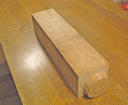 The front rail was even easier than the sides, since it was just flat, and the rear rail was flat, but with a buttress (plinth?) for the back splat, formed with the aid of a table-mounted router. The right-hand photo below shows the rear rail and the two side rails being test-fit, using some proxy rear legs. I had made these little leg sections so that I could use them as a guide to drill the holes in the rails and in the real legs in order to match up the dowel holes. All together, the seat rails took around 12 hours to complete.