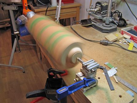 In order to turn the legs, they needed to be balanced around the spin axis. The blanks had two thicker sides and two thinner sides, so to balance the legs, I added counterweights to the two thinner sides. This would be necessary if a regular lathe was used too, except the counterweights would need to be much more firmly attached due to the higher speed. In this case, I was able to just tape them on since the piece was spun relatively slowly. Of course, in the shot below it looks like it is going at a pretty good rate, but it is a 1/25 second exposure, and the piece actually turned only a fraction of a revolution during the exposure.