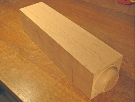 The cabriole leg shape often has a square cross-section with rounded corners nearer the top, changing to fully round nearing the bottom. Either way, they usually look the same from the front and side. This means that the profile can easily be cut out by using the same pattern from the front and side (although after doing the top, you must flip the pattern over to use the mirror image for the side). The legs were rough-cut using the bandsaw. I first made the two cuts from the side, and then reattached the waste pieces using tape. This maintained the square cross-section of the leg, which made the next step easier. Which was to roll the leg 90 degrees and make the two cuts required from the front.