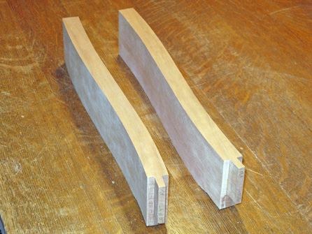 After that, the seat rails were pretty straightforward. The side rails were cut out of slightly wider pieces to account for the curvature. The photo on the left below shows the blocks I attached to help keep the wood exactly vertical for cutting. The two side rails with the front tenons cut out are shown below on the right.