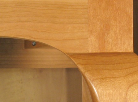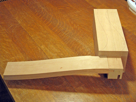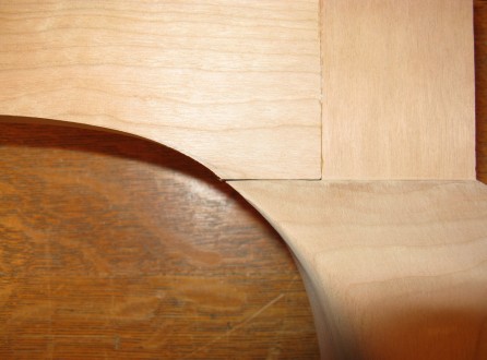 You can also almost see a faint pencil line on the bottom of the curve of the rail in the left photo above This is the desired finished curve. The rail and the leg were sanded together down to this line to produce the more continuous curve that can be seen in the right photo.