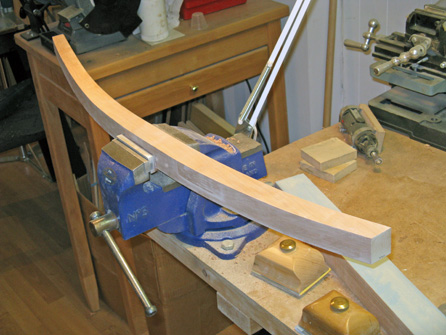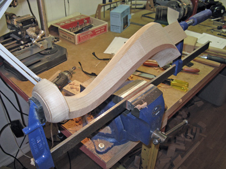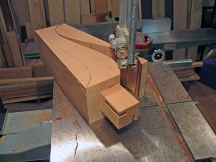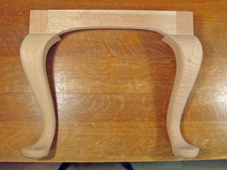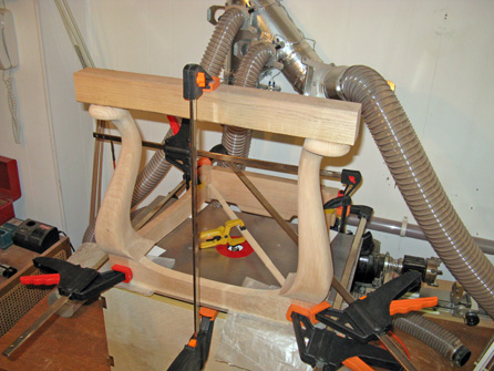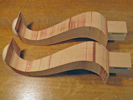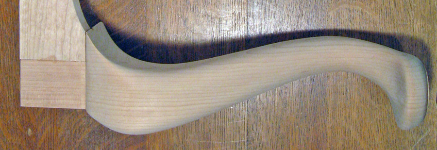 The above shot shows the completed right leg, already glued to the front rail. The glue squeeze-out still has to be removed, and the leg curve blended with the rail curve. I made the inside curve of both the leg and rail such that there was a bit of extra material left at the ends of the curves where they came together. This let me do final shaping after the two pieces were assembled, ensuring a smooth curve between the pieces. The front legs took about 22 hours to complete.