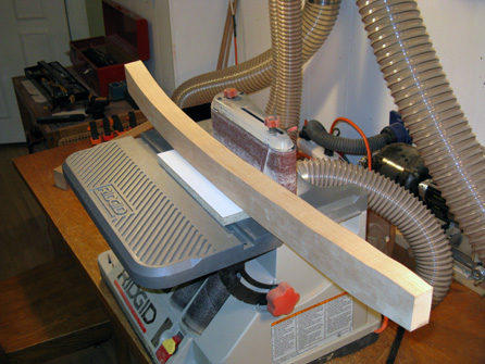 In the end, it didn't look like they warped much, but it's better to be safe than sorry. After their "ageing" period, it was then just a matter of cutting them close to the desired shape and sanding the heck out of them. I used a belt sander to do the outside curves and straight sections. For the inside curves, I used the belt sander with a curved form to give the belt a gentle curve. This got the legs very close to the desired shape. I then used some standard sanding blocks and a couple custom sanding blocks to remove any waviness left by the belt sander (or perhaps more accurately: waviness left by my operation of the belt sander). The photo on the left below (looking like something out of the movie Brazil) shows a leg on the belt sander.