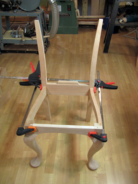 Theoretically, the whole chair could have been assembled all at once in one mad frenzy of gluing and clamping, but since glued joints are pretty tough to disassemble if an error is made, I did the assembly in five steps.