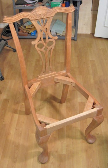 My original thought was to have the chair seat overlap the edges of the chair a little bit. However, I looked through photos of a number of Chippendale-style chairs and found that without exception, they all had the seat inset from the frame of the chair. So I figured I might as well conform.