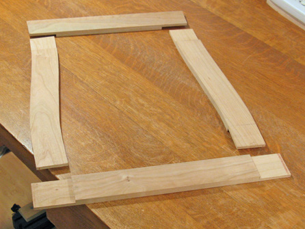 For extra cushioning, I decided to use the frame-and-webbing construction. I started with a frame made from leftover cherry. I wanted it to be as thin as possible, but it needed to be strong enough to handle the forces exerted through the webbing. I used half-lap joints on the corners, with the thought being that these would resist twisting forces (all sides of the frame will be twisted inwards since all the force from the webbing is on the top of the frame). The photo to the right shows the four finished sides of the frame, ready to be joined.