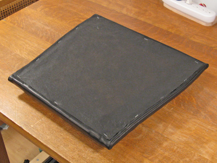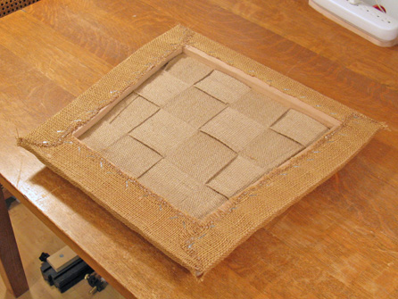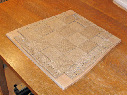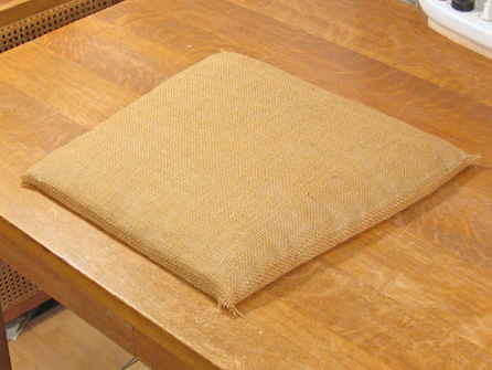 I had originally thought that a one inch thickness of even high-density foam would not be firm enough, so my first try was to use a softer 2" foam, and pre-compress it down to an inch. I used a thick thread and a longish needle to manually sew through it, first on a 2" grid, and then finer when that didn't work very well. However, even more closely-spaced sewing (and burlap facing on both sides) still left large lumps between the points at which it was sewn. I managed to get the thickness down to maybe 1.5", so that looked like it wasn't going to work, and I went back to the high-density foam approach.