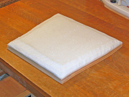 Unfortunately, I was able to find only 2" thick foam in the high-density variety, so I ended up starting with that. To get it down to 1" thick, I sharpened up our 10" kitchen knife and sliced my way through. That worked out reasonably well, and I put the sliced, not-quite-flat, side down and left the nice finished side for the top.