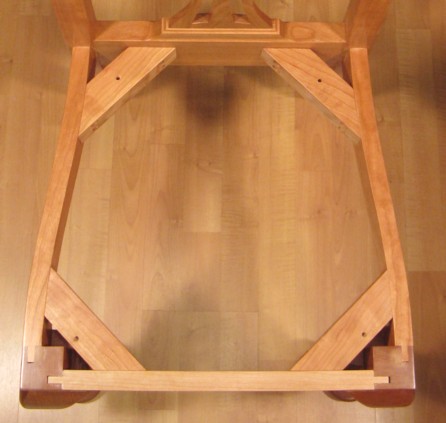 The final assembly stage was to add corner braces to the seat section. The idea was to add strength to the corner joints, and also provide a larger base on which to mount the seat. These parts were unique in that they were glued and screwed to the side rails - the screws are the only non-wood parts in the chair frame (other than glue, of course).