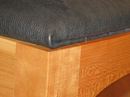 The seat was a bit of an afterthought. Oh, I knew I needed one, but I hadn't put much thought into exactly how I would make it. I knew I wanted to keep the overall seat height fairly low - it is easy to go 2 or 3 inches high, but I didn't think that would look too good - and I didn't want an odd-looking seat material whose pattern would distract from the woodwork on the chair. To avoid the latter problem, I decided on leather for the covering. That turned out to be a fair amount of work due to the thickness of the leather, but at least it is a timeless sort of covering - no "what was I thinking when I picked that fabric?" issue in a few years.