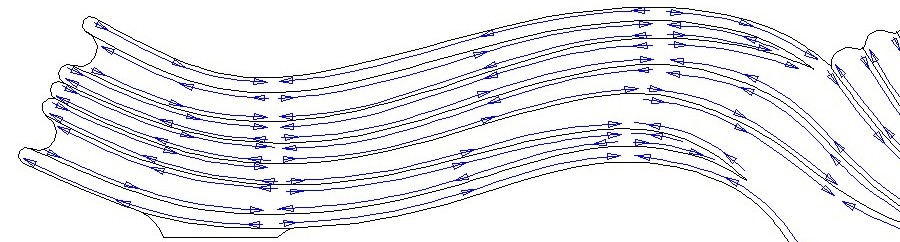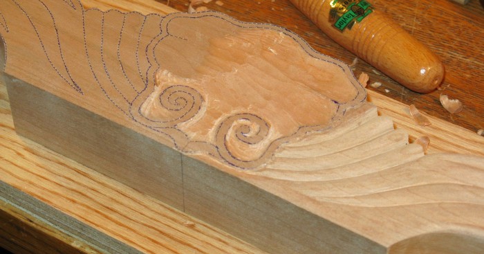 The cherry cut fairly nicely with sharp tools, but when carving a curved shape, the direction of carving is different for every part of the curve, so nice big, long, luxurious shavings were just not in the cards. And inattention to where exactly was being carved could lead to big unwanted slices and the "oh crap! Hope I can sand that out" syndrome. The diagram below gives an idea of carving directions. And yes, I was able to sand most of my goofs out.
