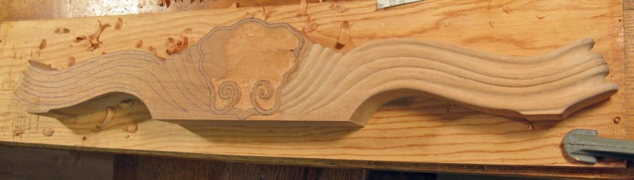 As is my usual habit, I started with what I thought might be the hardest part of the chair, which in this case was the top rail (although the back splat gave it a run for it's money). The rail was cut out and the outline was shaped as far as possible with bandsaw, spindle sander and files. Then I traced the contour pattern onto the faces and worked on giving them some depth. The first photo shows the rail with most of one end of one side roughly carved out, and the next is a closer shot of the center "shell" portion, just started. The bottom shot is of the completed top rail.
