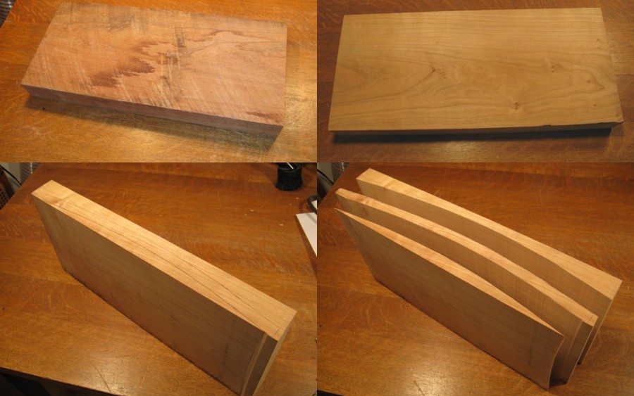 I worked on the back next. As the montage shot shows, I started with a cherry plank and cut a curved blank out of it, making it the back splat blank plank.