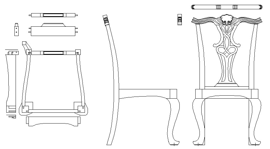 This was the final look of the plan. This is the basic outline view, but the drawings include other details such as the size of the wood stock required, carving depths and contours, etc. The time required to do the drawing was not included in the times I give for making the chair.