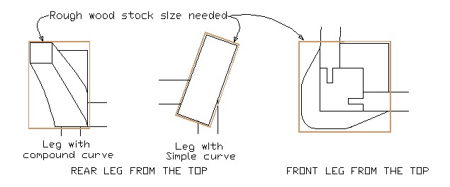 As mentioned above, I made sure the rails were fit to the front legs prior to shaping the legs. The left photo below shows one of the side rails in one of the legs. The curved contour of the rail bottom has yet to be cut.
