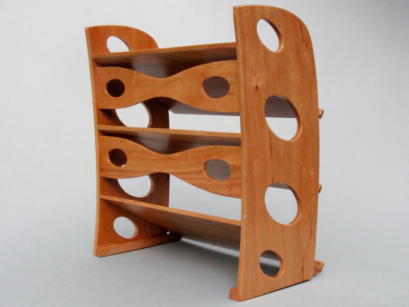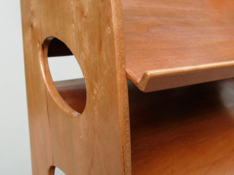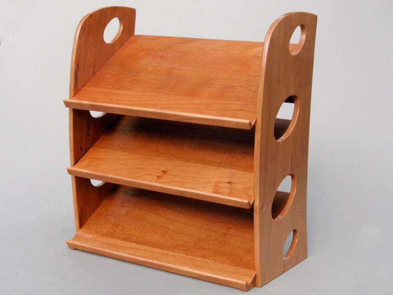 construction was fairly straightforward with three thin cherry planks for the shelves glued into dados routed into the two side pieces. The sloped shelves reveal the charger faces, making it easier to distinguish between say the flattish one with the three contacts near the center or the flattish one with the three contacts near the end. The rack is pretty much full now so if any additional chargers appear, there will need to be some ruthless winnowing of the current models.