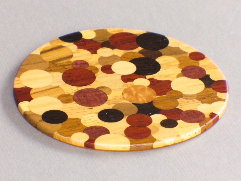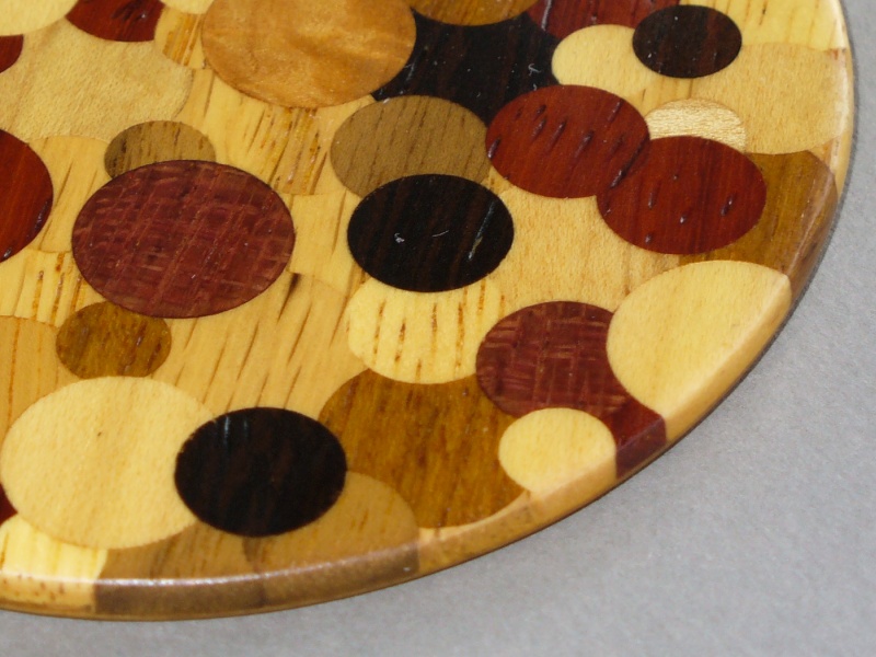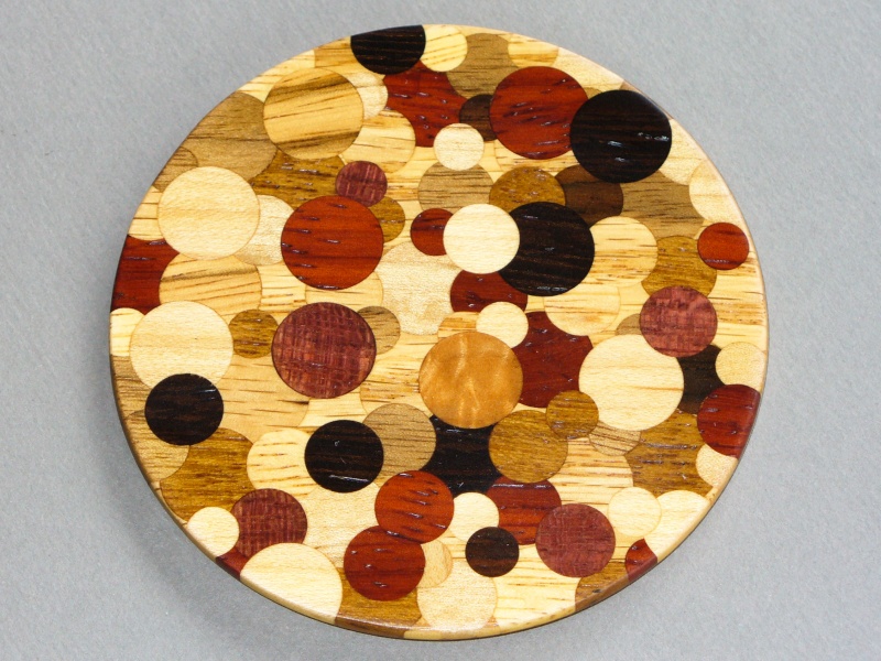 I cut a number of plugs with a tapered plug cutter in a variety of sizes. I just went to my wood shelf and grabbed interesting looking woods so the plugs are in various colours and grain patterns. All the plugs were cut across the grain so that they show normal wood grain rather than end grain. I then started with a piece of oak and drilled a few holes. Into those I tapped in and glued some plugs. After the glue was dry, I cut them flush with the surface. I repeated this process until all the original oak was gone and only plugs were left. I then formed the circular shape, cut it to the desired thickness, and added another thin piece of wood as a base. It made a fairly interesting looking piece, especially since the various types of woods are "through and through" as can be seen on the edges.
