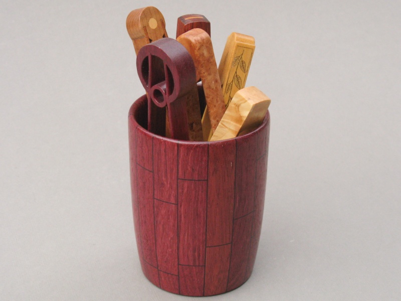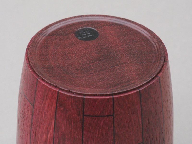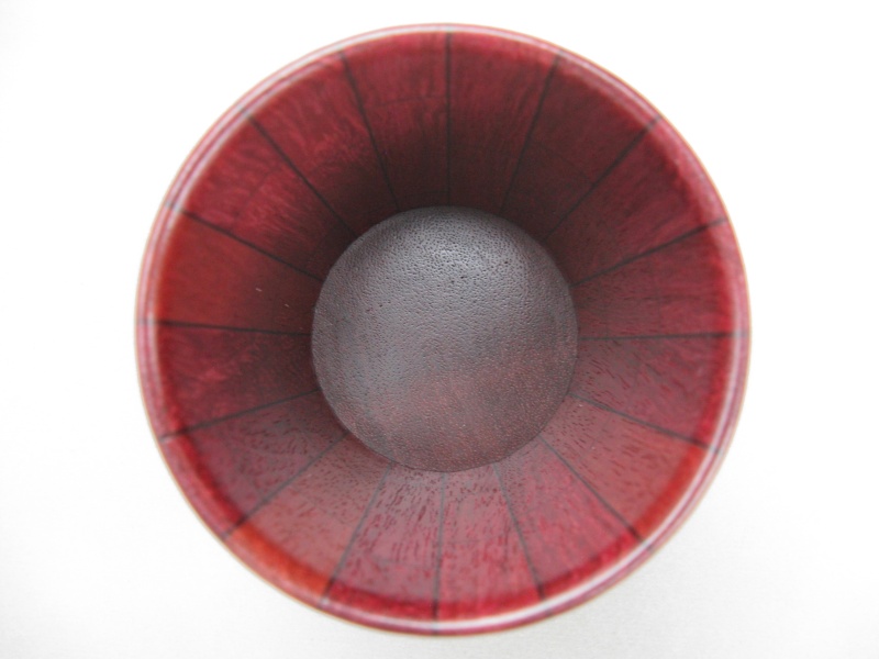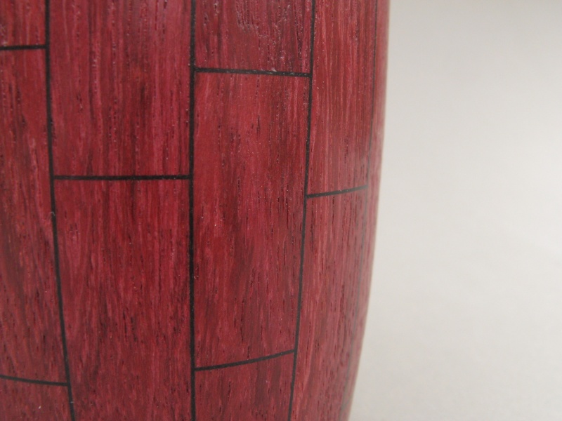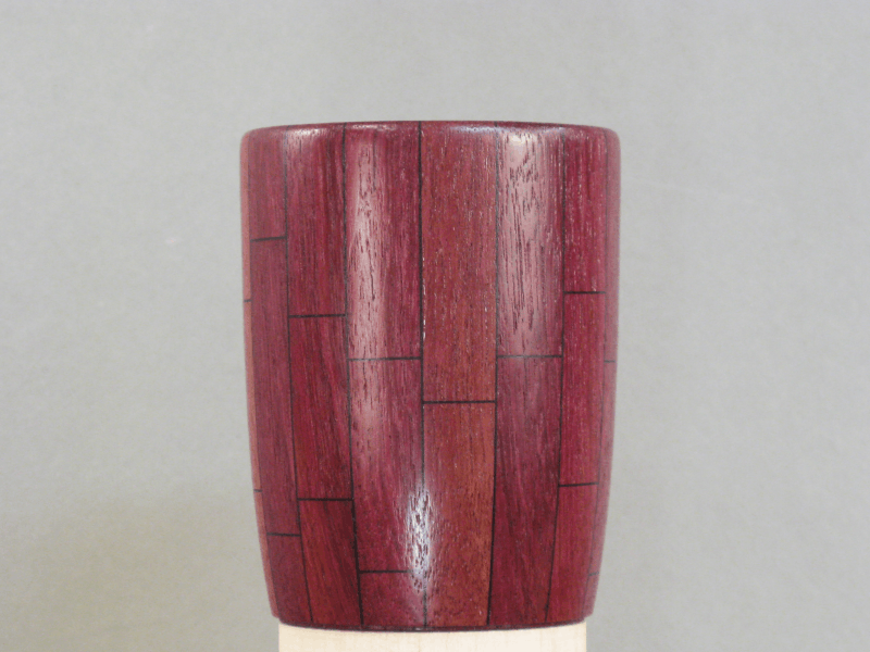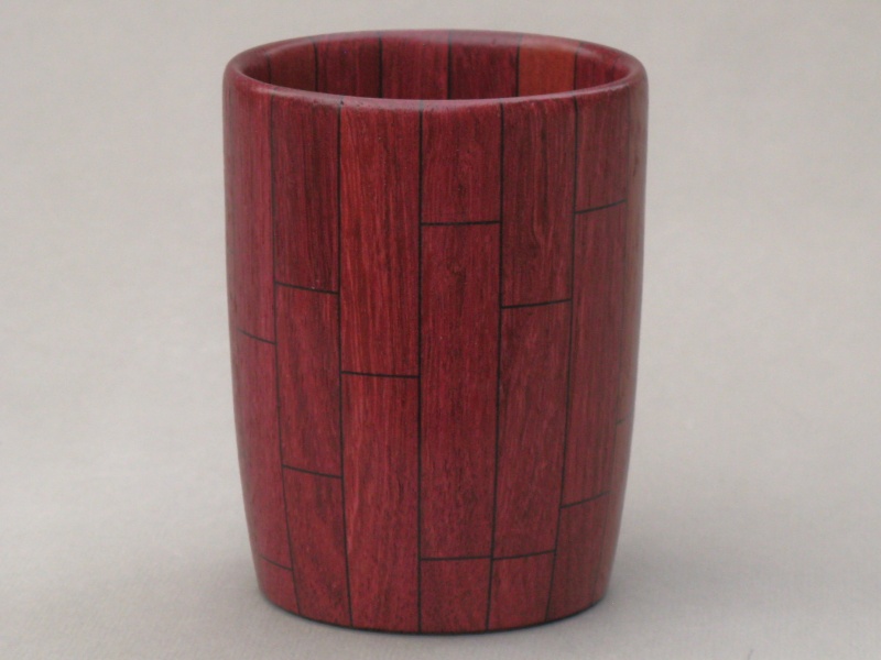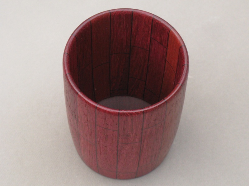 This cup (not really a mug since it is handle-free) was constructed using 16 staves of Purpleheart, each composed of two or three pieces and with all pieces separated using dyed black veneer (of mystery wood species). In addition to the universe improvement factor, the project also gave me the opportunity to use up about half of the small Purpleheart scraps I had kicking around - Woah - a win-win solution! The