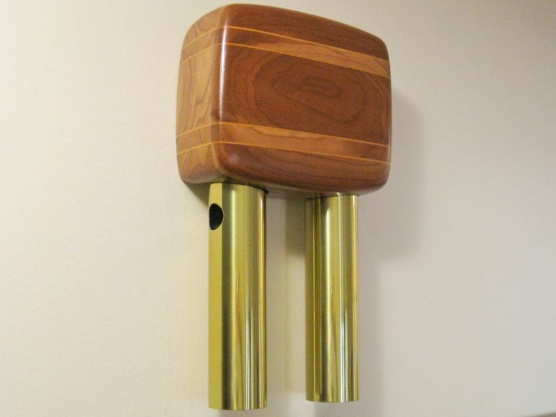 In what seems to be a common occurrence with me, I was unable to find something to buy that I liked. In this case it was a doorbell. In fact, I did buy a new one, but I did not like it at all, so I set out to replace the cheapo yellowing plastic cover on our old doorbell (whose innards still worked fine after a bit of maintenance). I ended up making this fairly simple Cherry cover with Yellowheart inserts. The inserts were more functional than decorative, since my piece of Cherry was not actually large enough for the doorbell. Due to this problem, I needed to expand the height and since I had joints anyway, I made them stand out with the contrasting wood. I thought the end product looked rather plain, but it was way better than the original plastic cover.