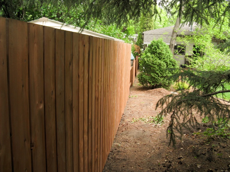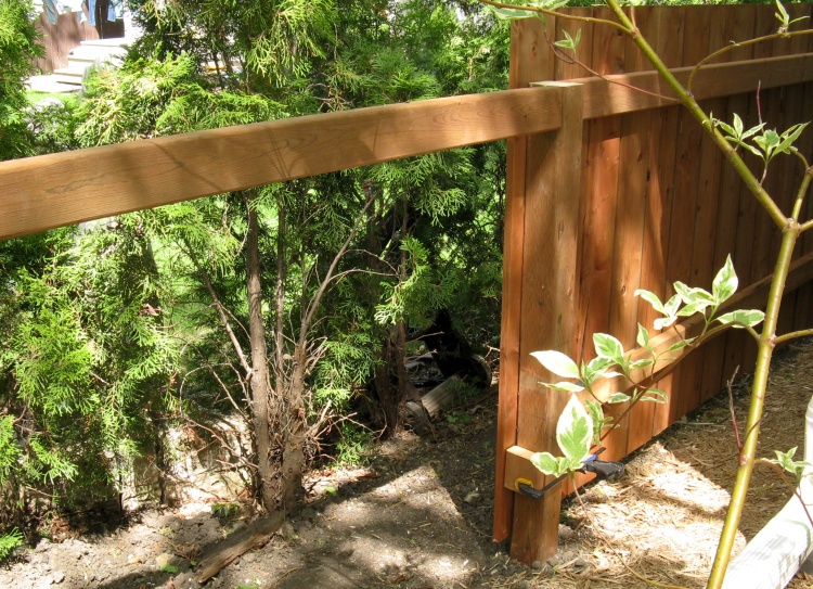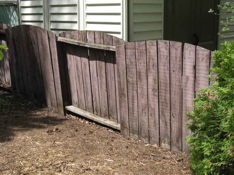On the other hand, it was made of rough-cut 1"-thick planks with an incredibly durable stain. We assume the fence is 40 or more years old and we haven't stained it in the 25 years we've been here. Of course the color is an odd purpley-reddish with some sections heading toward bluish so the color durability is a bit of a mixed blessing.