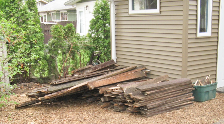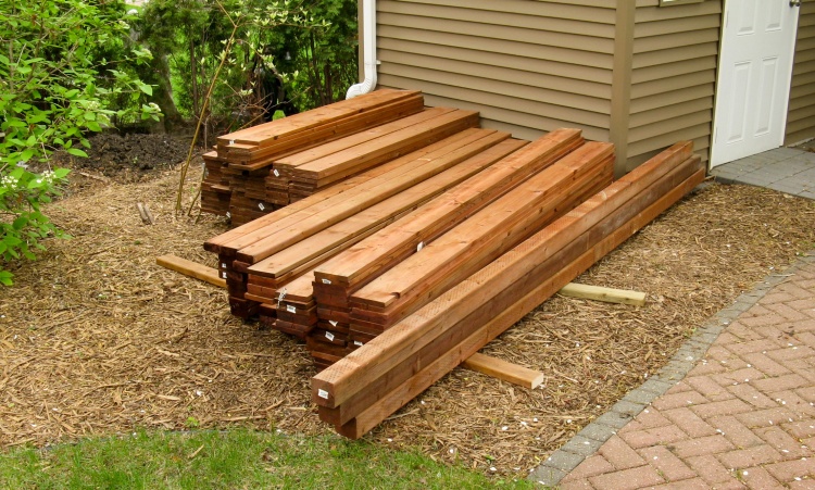 This photo shows the pile of new treated brown wood stacked next to the shed (before the late 4x4s showed up).