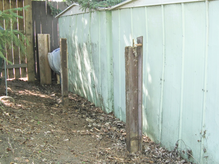 Of the 15 posts in the original fence, most were broken already or broke off during disassembly, leaving just four standing, two of which are shown here.