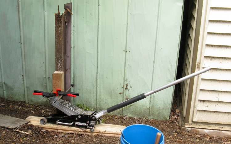I have a nice high-lift hydraulic floor jack that seemed like it would be useful to help lift the posts out. I screwed together a block from 2x4 scraps. It had some screws sticking out to create barbs on the inside and this was clamped to the post. Then the jack was employed to lift the post using the block.