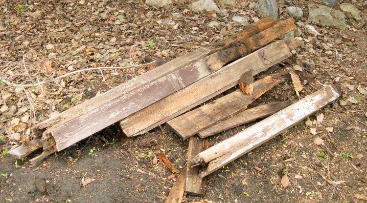 This pile has a couple of the posts that I pulled out (and a couple broken-off versions too). You can see the underground part is noticably thinner where the wood has rotted away.