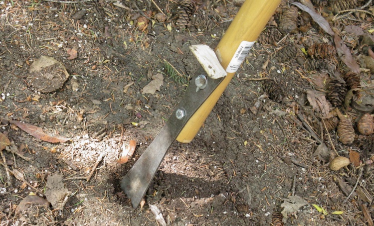 And of course on the first hole came the first root. I decided I needed a root-chopping tool so I bolted together this old shovel handle and a pry bar. After sharpening, it worked pretty well for roots up to about 1/2" diameter.