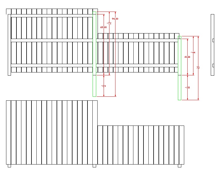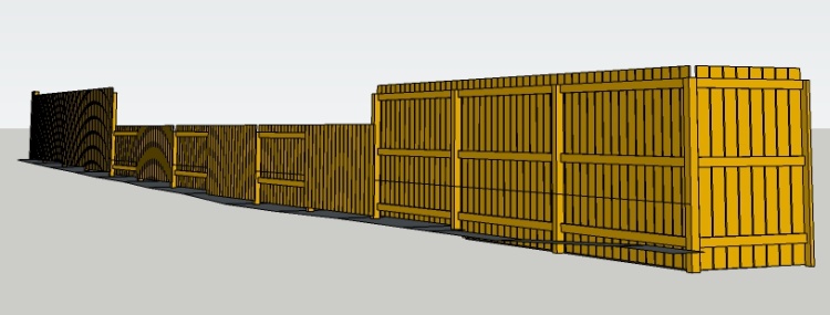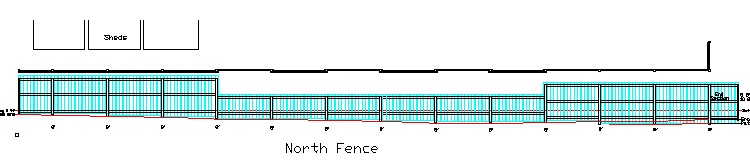 This shows the "South elevation" in architect-speak. There will be tall sections at both ends flanking a shorter center portion. The pickets will have the lengths trimmed in each section to clear the somewhat sloped ground contour.