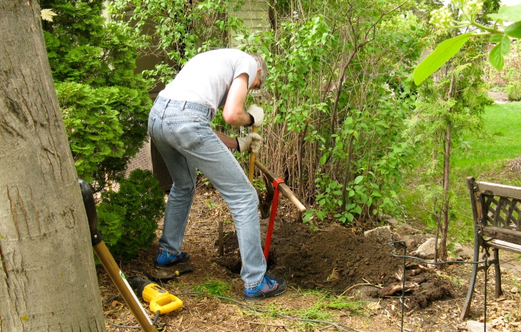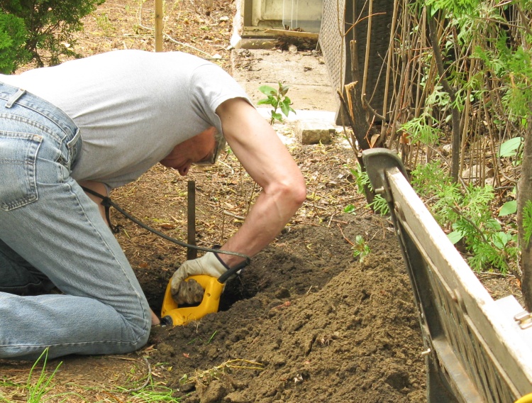 Here I'm using Ray's saw after I took over digging a hole he was halfway through when he had to run off to do an errand. Between the two of us, we dug the 13 holes over the course of about four days. They were dug about 27-30" deep and were mostly pretty easy holes (few rocks or gravel) so we can't complain.