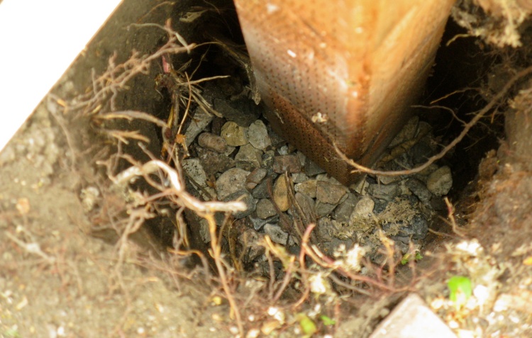 I added two or three inches of coarse gravel to the holes to aid drainage at the bottom. This was tamped down to make a solid base for the post.