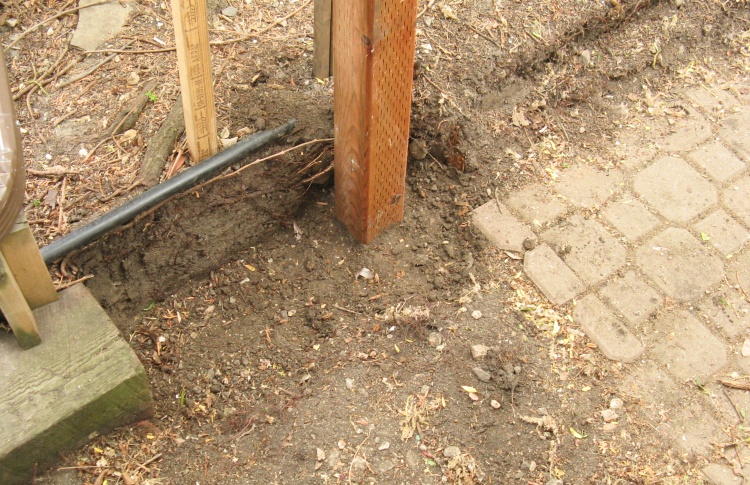 Here the first post is in place, at the corner of the neighbor's paving-stone patio.