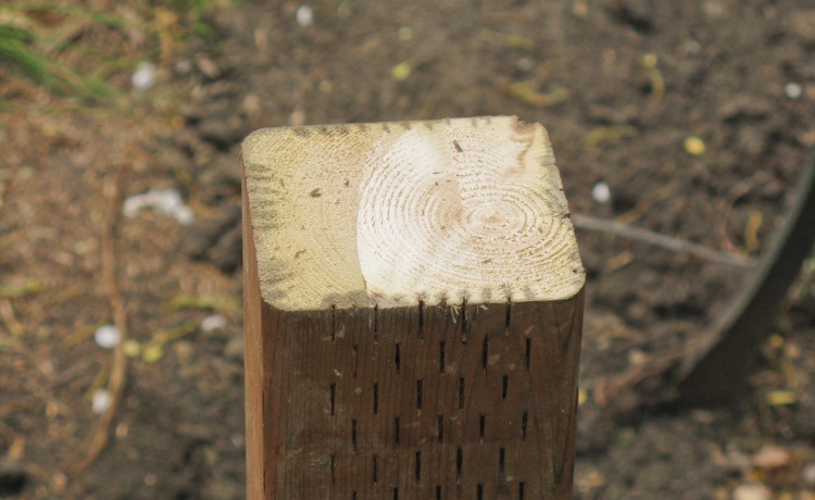 The fence longevity must at least be partly due to being shielded from the wind by adjacent sheds, trees and bushes since many of the posts were rotted at ground level. The 2x4 repairs on these sections were in place before we moved in.