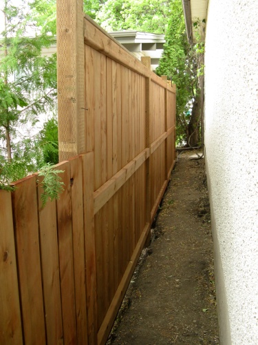 The old fence was a "good neighbour" design with 4-foot sections of pickets on alternating sides. It had mostly sagged to the ground so the bottom rail was largely mulch and there were lots of other rotted parts.