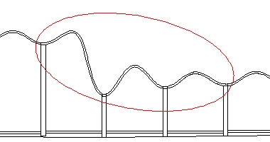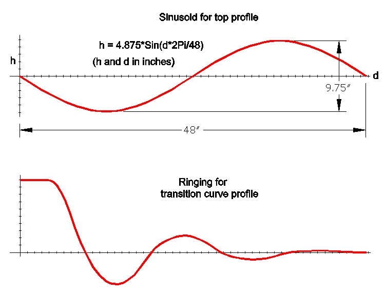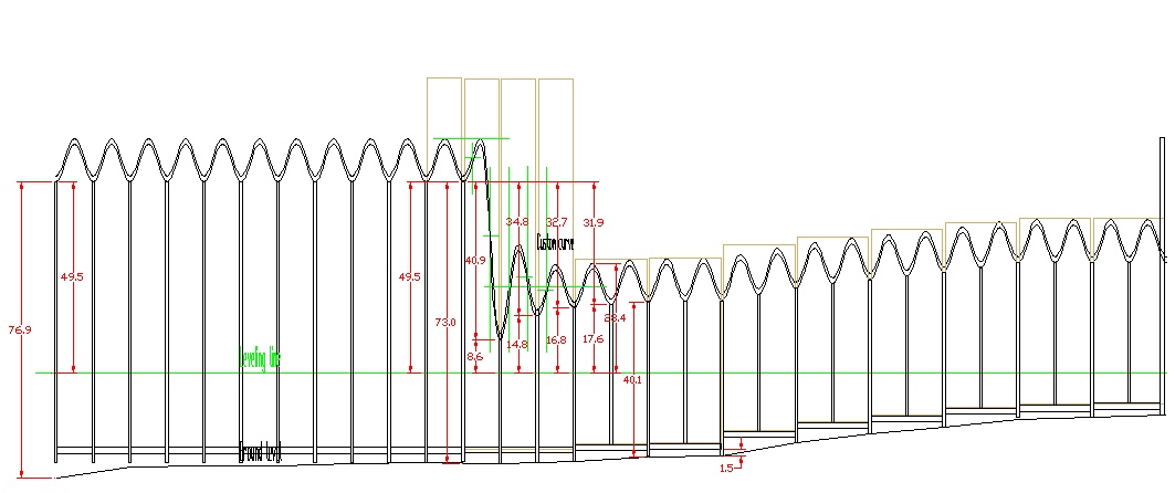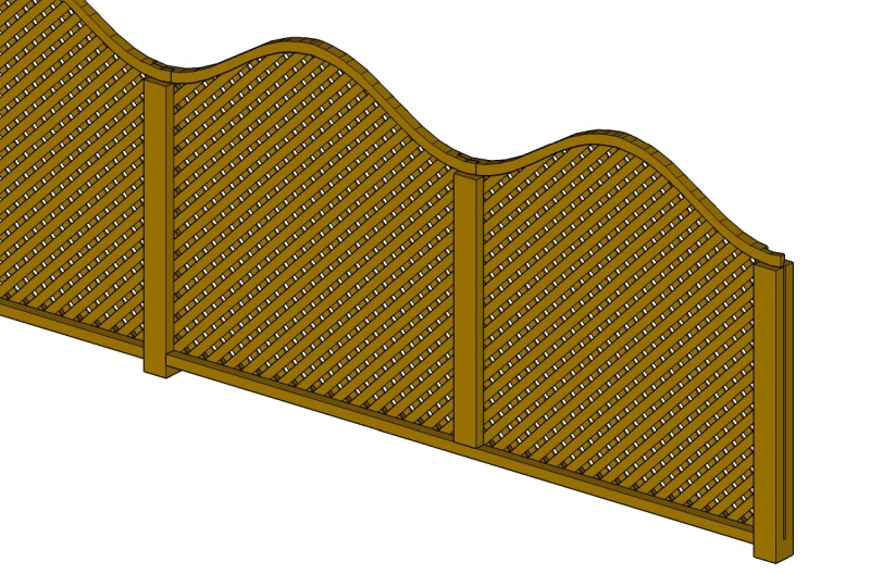 The top profile of the fence is of course sinusoidally-shaped with an amplitude of ±4.875" (so 9.75" overall height) and a period of 48".