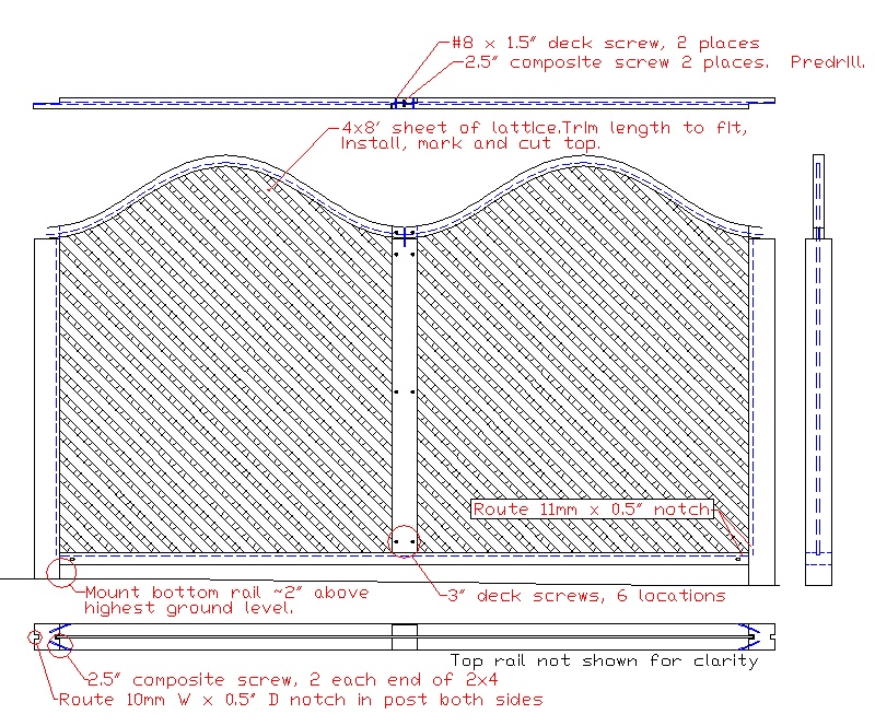 So for the tall sections I opted for posts spaced at 4' (rather than the more-conventional 8' post spacing). That gives a narrower gap which is all spanned by the single sheet of lattice. It still wouldn't be super-strong, but should be adequate.