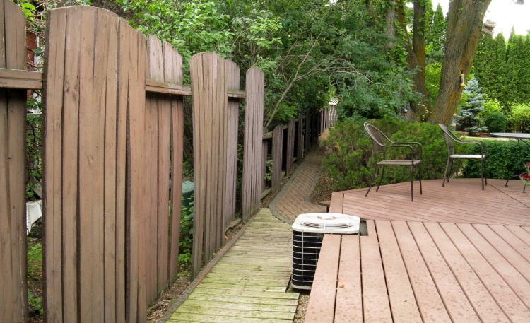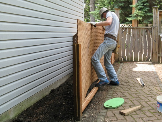 "The old fence was a "good neighbour" design with 4-foot sections of pickets on alternating sides. It had mostly sagged to the ground so the bottom rail was largely mulch and there were lots of other rotted parts.