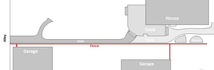 To put things in perspective, this shows the location of the fence in red with our house at the top. The fence extends from the alley to the front edge of our house with a couple offshoots to the neighbor's attached and detached garages.