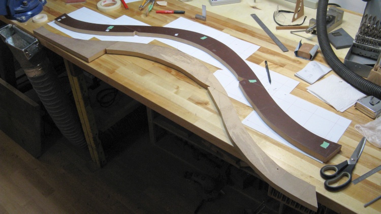 I made a couple patterns from MDF to enable a consistent curve shape. The right edge of the burgundy pattern is for the top edge of the curve while the right edge of the unfinished pattern is for the bottom edge of the curve.
