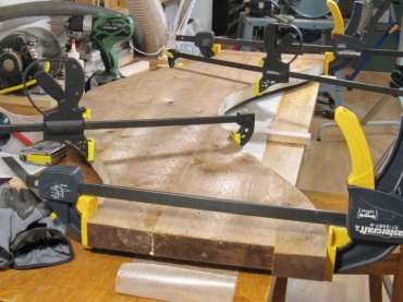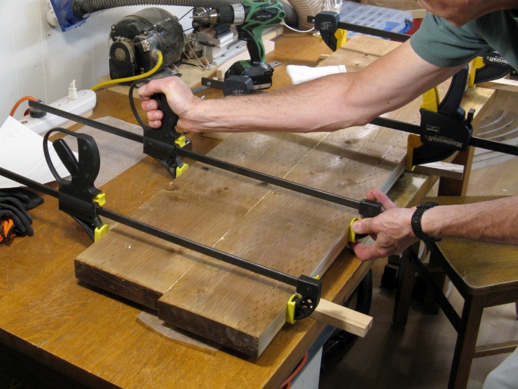 Gluing on those thin 2x8 edges I had saved - Lotsa Clamps method