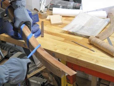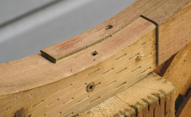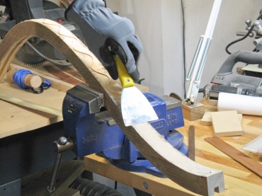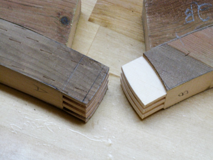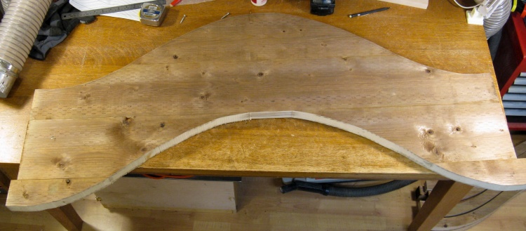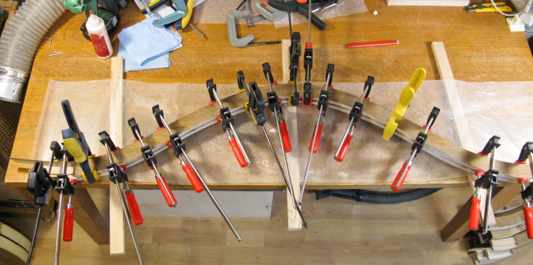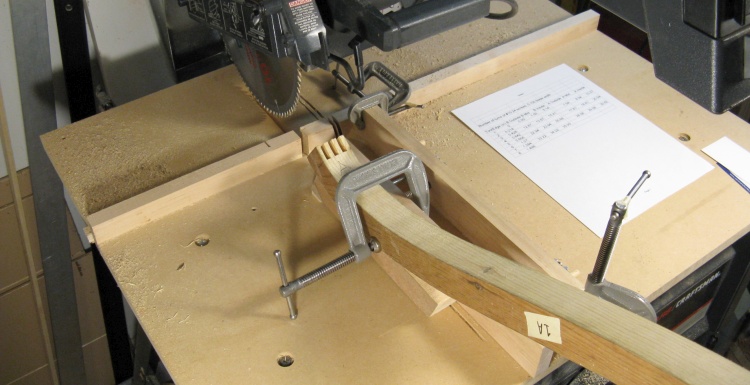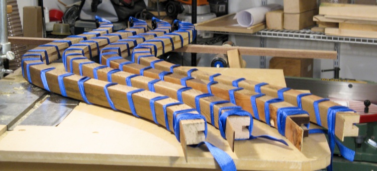 I had made a set of curves last year to check out my technique (which worked OK) but since the top edge is cut, it shows an almost-white raw wood color in contrast to the light brown of the sides. I thought the curves would look better if the tops at least were a matching brown. To accomplish that, my plan was to glue thin slices of treated wood edge to the curve tops.