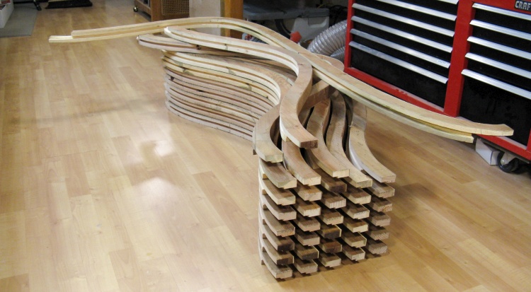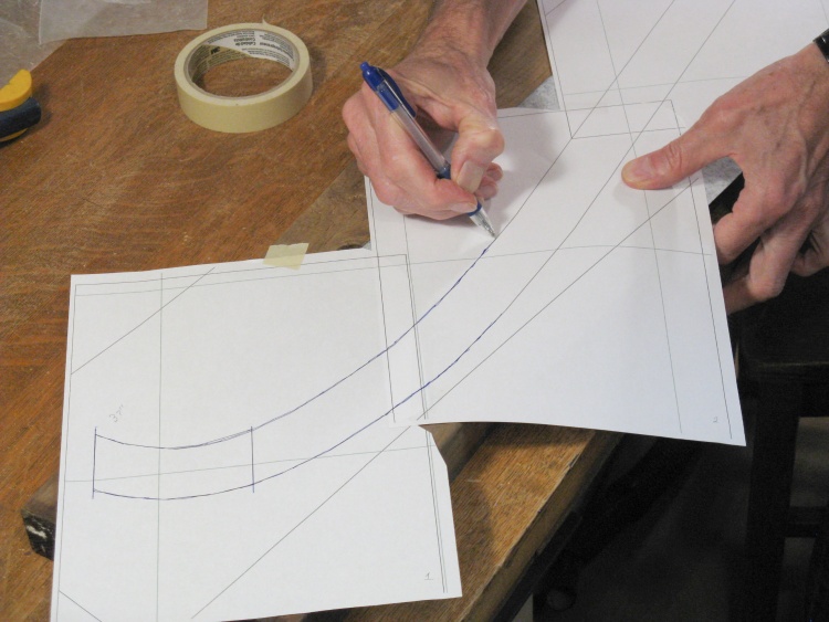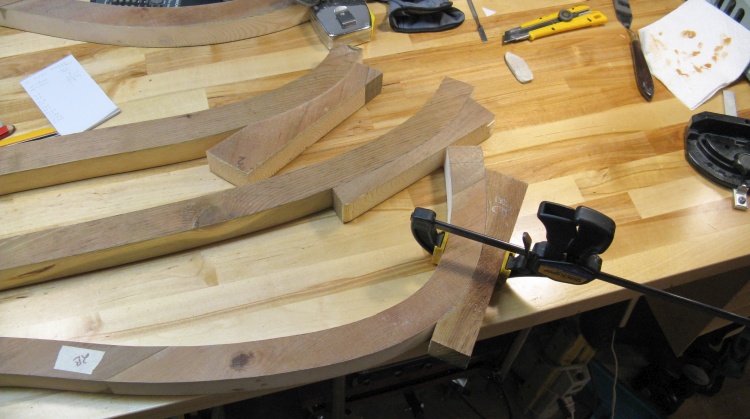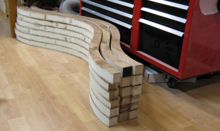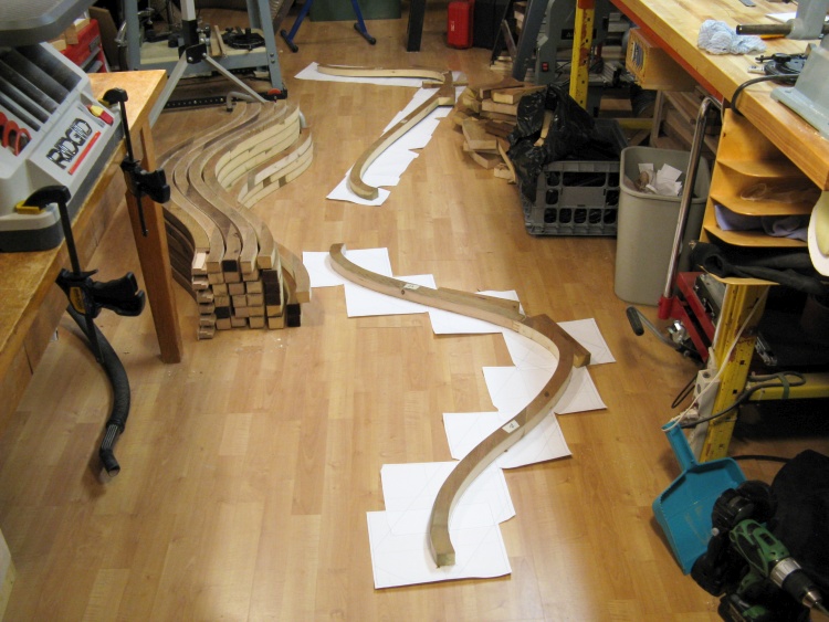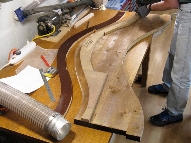 I printed out full-size plans and then traced the curves directly onto 2x8s. The curves were large enough that each needed to be made from two half-curves that were later joined.