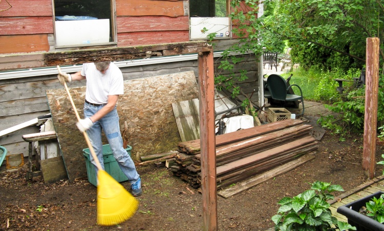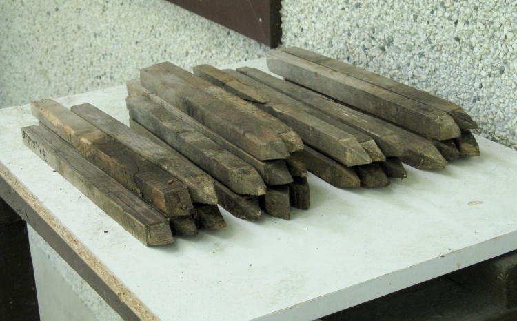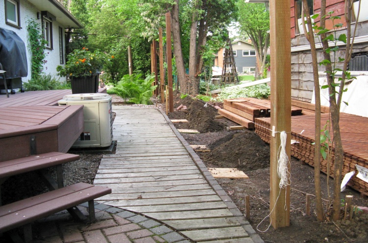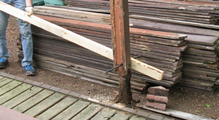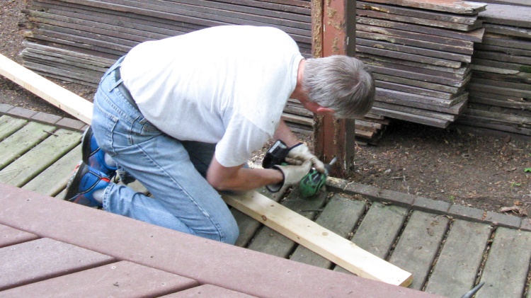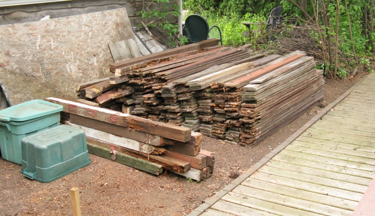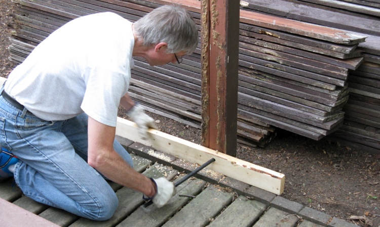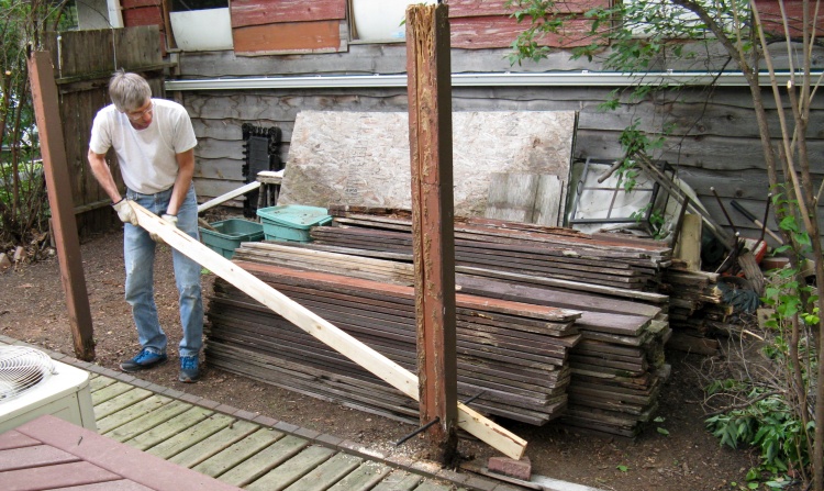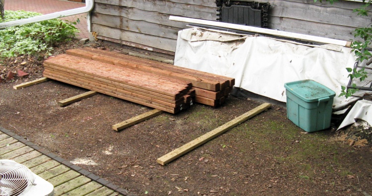 The fence will be constructed of brown treated wood, and these first random-length ones I'm using are actually leftovers from last year's deck-building project.